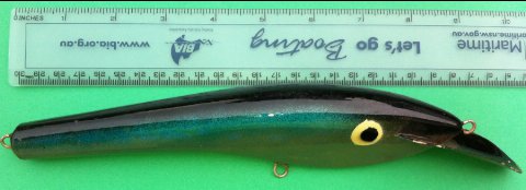 The ALM Chopper is by far the most common of the range. There ALM 'Hoobait' is shown opposite and was alos made in small numbers for big pelagics such as wahoo. All ALM lures are moulded and most are signed near the tail.