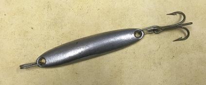 Oldstone Celt lures are a an unknown entity. This is the only two ever found and has the motif of a kangaroo embossed onto one side of the lure with the other plain shiny metal. Made from aluminium alloy and quite light for its size. Both measure 10cm (100mm) and note top lure is fitted with oval split rings and look original.