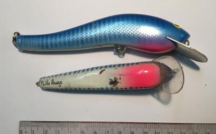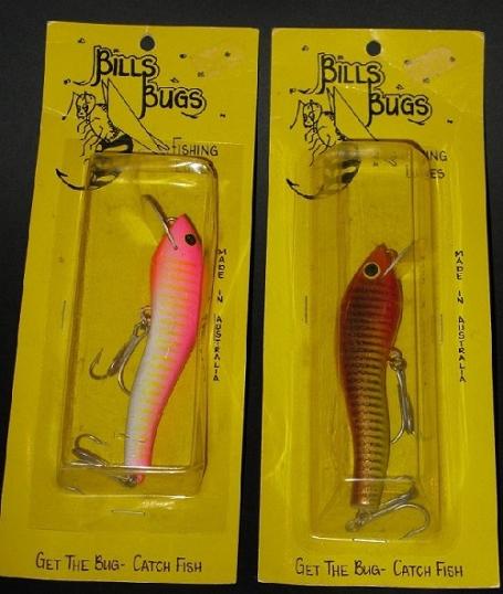 Bill Clark is a very inventive lure maker from Yamba in northern NSW. Maybe his most famous lure was the 'Flutterbug' which came in a number of sizes suitable for any surface feeding fish. Originally shaped from timber with heavy duty metal bibs Bills Bugs were available from the late 1980's and then moulded plastic as demand became higher.