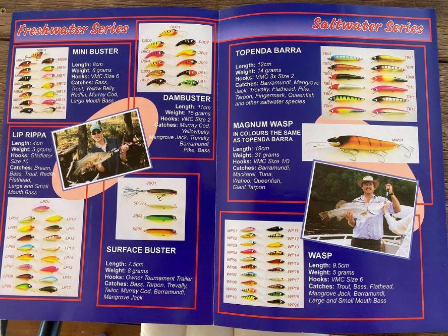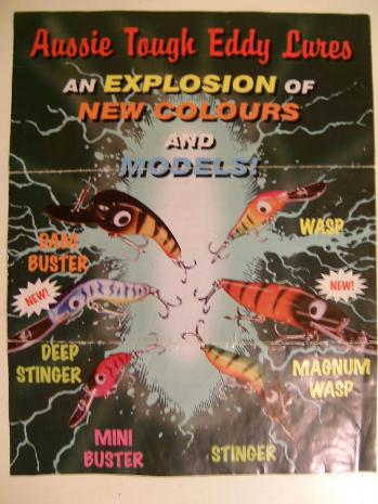 Dave Edwards was born and schooled in Brisbane before marrying and settling in Toowoomba. His love of fishing gave Dave and a chance meeting with Peter Newell and this inspired him to try his hand at lure making more seriously. The deeper diving lure formed into the 'Stinger' and 'Dam Buster' patterns in 1988 and were made of cedar. By 1989 with demand outstripping supply the lures, Alan Dolan from Lively Lures was enlisted and the lures were moulded in plastic. By mid 1993 two new models, the 'Mini Dam Buster' and 'Wasp' were released. Acknowledged as reliable fish catchers in fresh and saltwater the deep version of the 'Stinger' was released by 1995 along with the Magnum 'Wasp' and the large Stinger. Dolls eyes were sometimes different due to supply however most will have white/black dolls eyes from this time period. Around 2000 the business was taken over by Darren Storm till 2007 when Nick Clarke from Redcliffe took over. The 'Dambuster' models and 'Lip Ripper' were owned by Jamie Harris of JD Lures who then sold them in 2014.