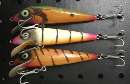 Ron was also a fan of nude and semi-nude lures (clear coated timber) - these models are a mid sized lure.