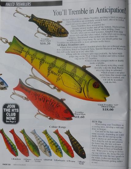 The original Halco Combat colour range. Some of these colours are difficult to find and were quickly deleted from the standard range. Extract Harbord Tackle, Sydney, 1991.