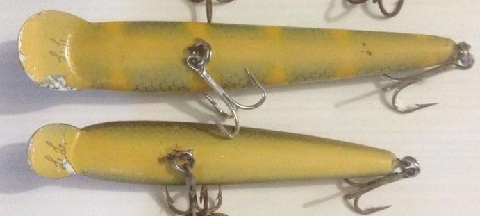 (Above) Some of the earliest Leads lures with signed bibs including the smaller minnow dated to 1969.